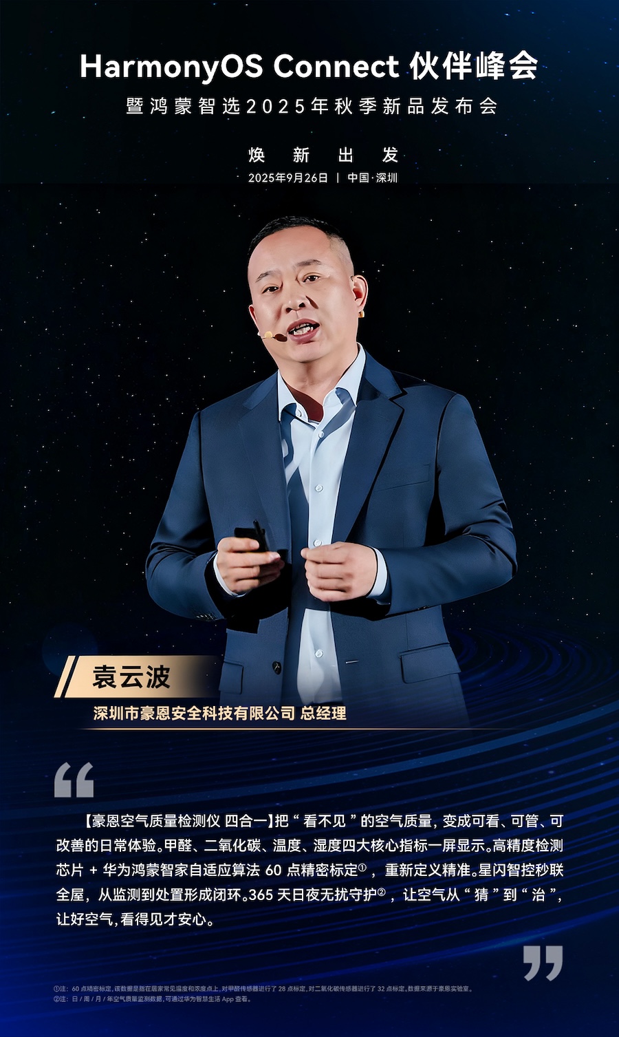 作為首批加入鴻蒙智選的生態(tài)合作伙伴之一,中安科全資子公司深圳市豪恩安全科技有限公司(下文簡稱豪恩)推出全新智能家居產(chǎn)品——鴻蒙智選 豪恩空氣質(zhì)量檢測儀。豪恩總經(jīng)理袁云波代表公司發(fā)表演講,中安科集團副總裁胡剛蒞臨現(xiàn)場,共同見證。